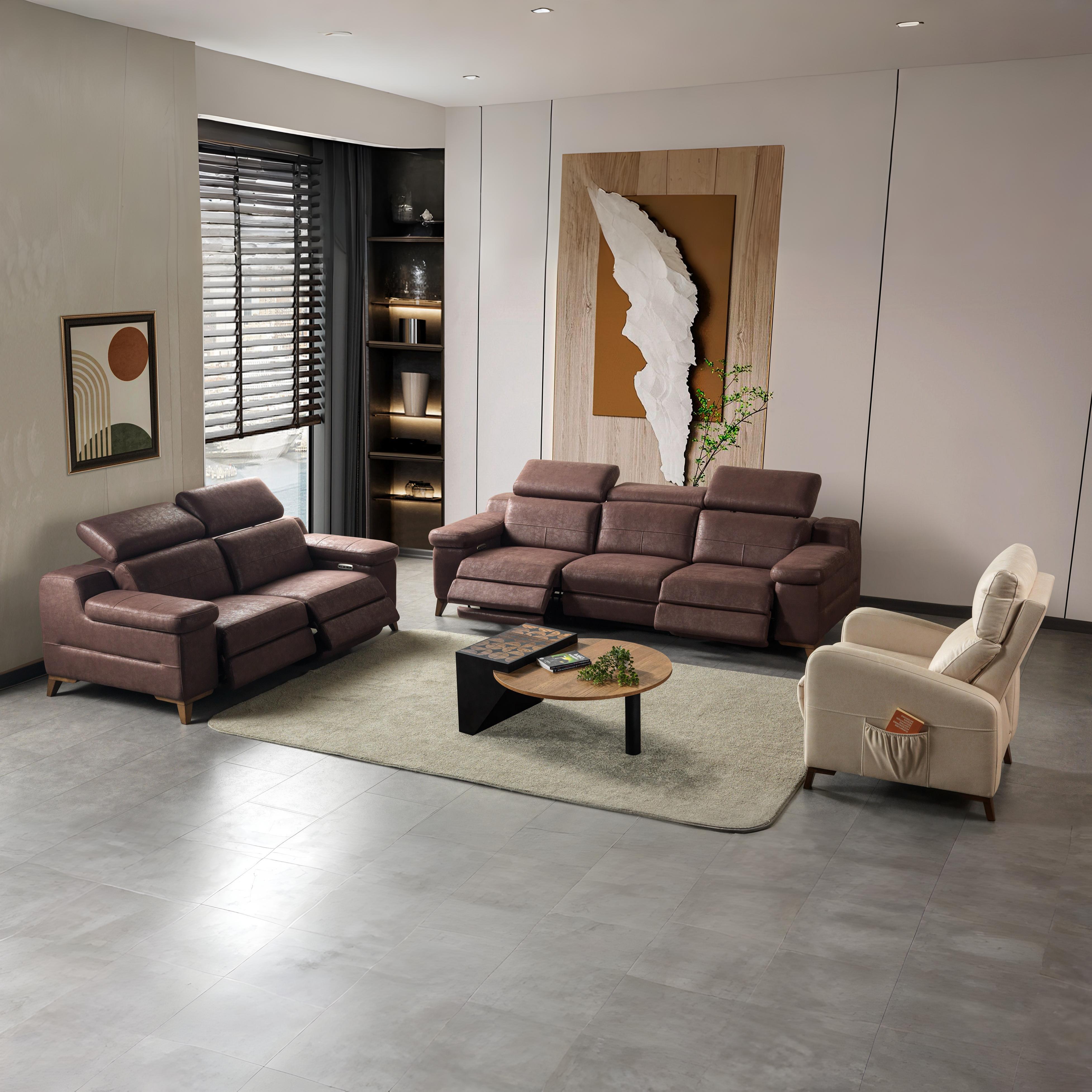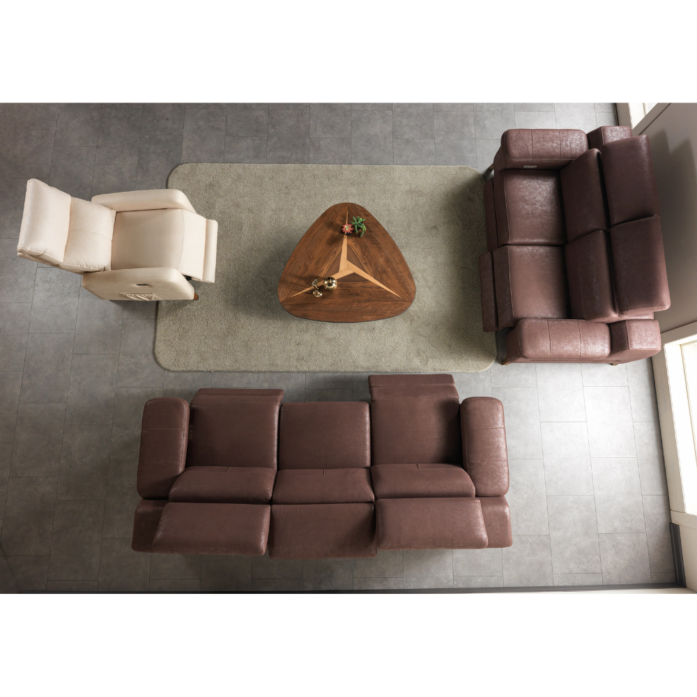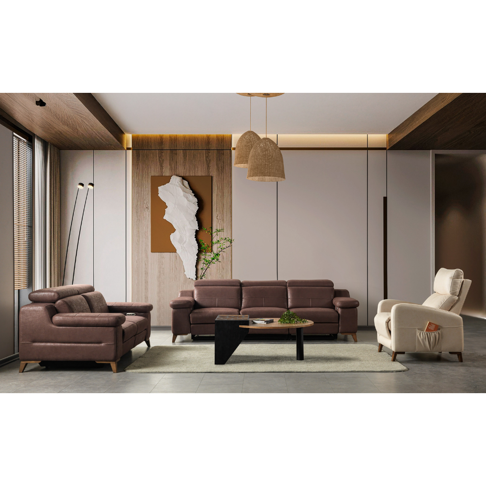 Serena Motorlu Recliner Koltuk Takımı, motor kontrollü recliner mekanizması ve başlıkları sayesinde TV karşısında dinlenme, kitap okuma ve uyku modlarını kolayca kullanmanıza olanak tanır. Her oturumda 145 derece yatış açısı ile maksimum konfor sunar. Geniş ve ergonomik oturum alanı sayesinde uzun süreli kullanımda rahatlık sağlar. Takım, 3’lü, 2’li ve tekli modellerden oluşur ve tüm oturumlar motorlu mekanizma ile kontrol edilir.